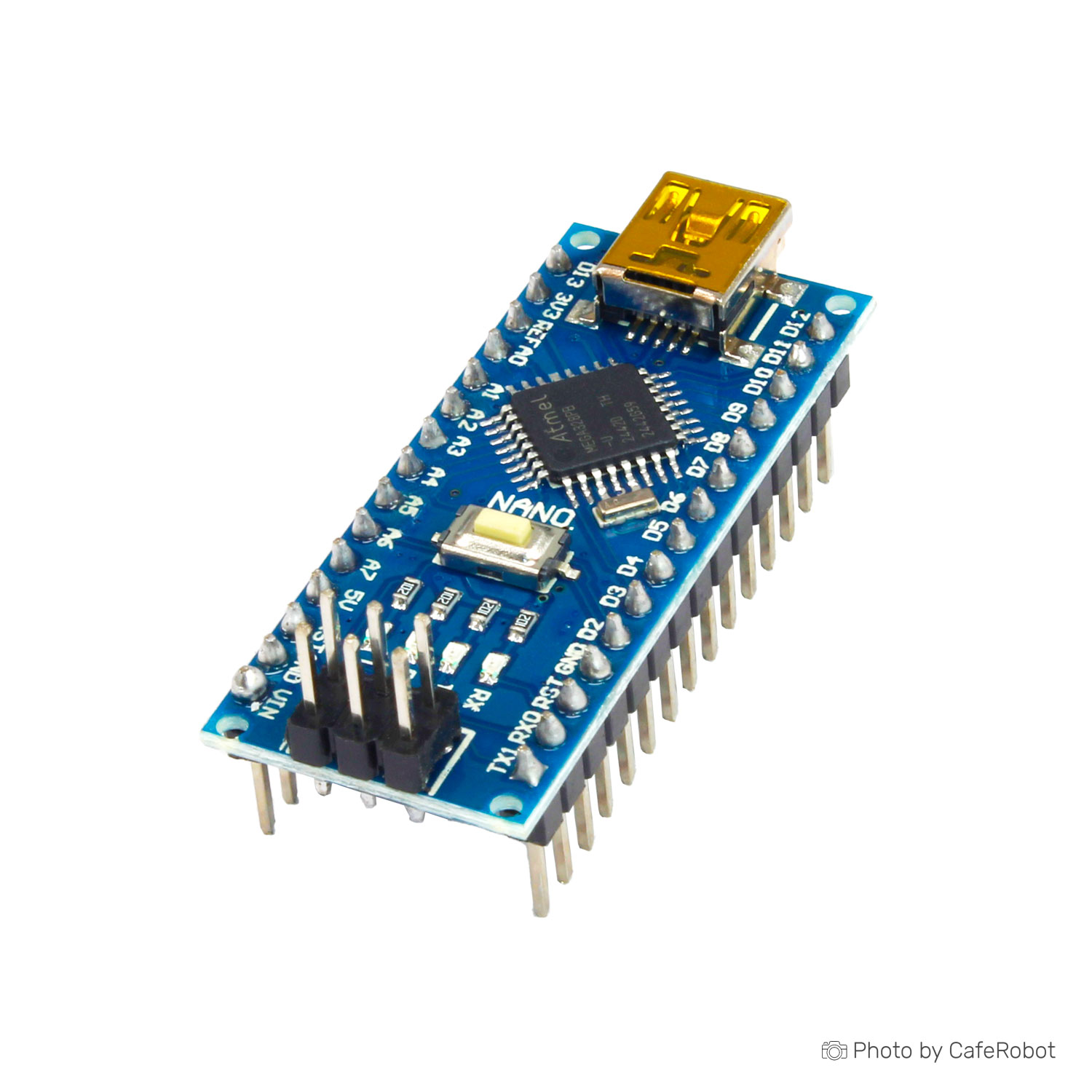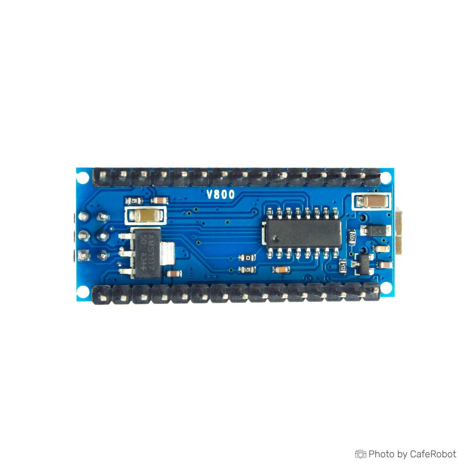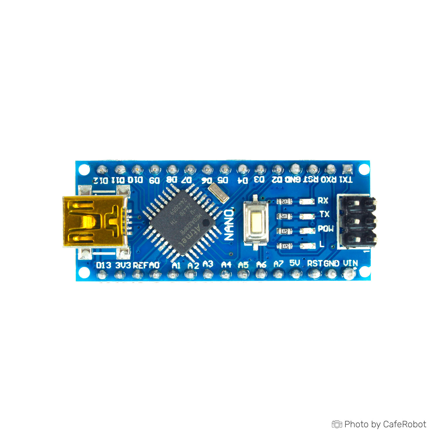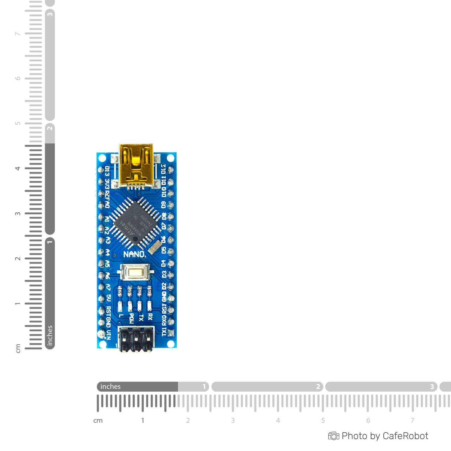 NANO V3 based on the ATmega328 microcontrollers has a small size and can be used together with model boards for solderless wiring (breadboard). It has the similar structure with Arduino Uno/Duemilanove, but different size and with additional Analog In A6, A7. To reduce the size, components are mounted on both sides of the PCB. The board uses a chip CH340G as converter UART-USB. Chip CH340G – is a budget solution. With an operating frequency in 12Mhz, yields a stable result of a data interchange.