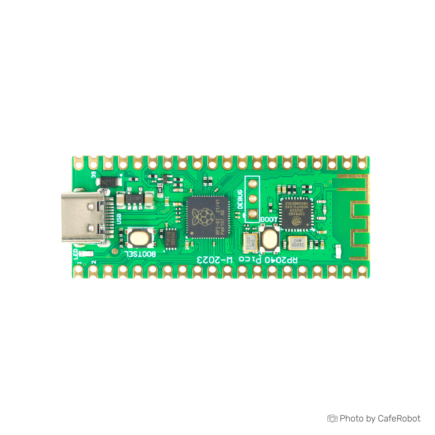 This is the Raspberry Pi Pico W, the newest board from the Raspberry Pi Pico series. The W stands for Wireless, so it offers a 2,4GHz wireless internet (WiFi) connection.